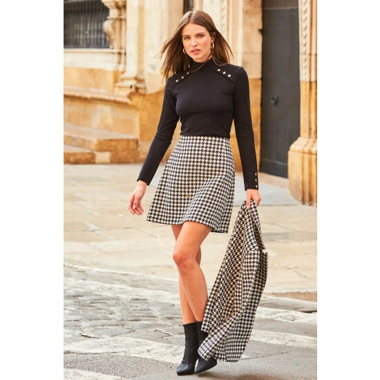Minis are having a moment, timeless dogtooth check, classic a-line shape, for work and weekends, create an on-trend skirt suit with the matching blazer, it looks effortlessly chic with a black polo neck. Model is 5 9 and wears a UK size 8.