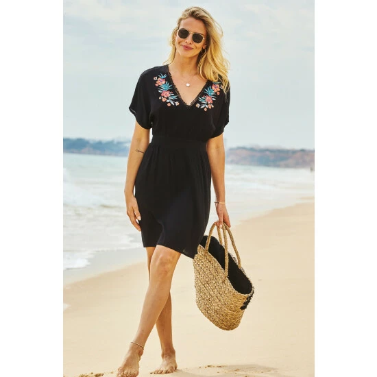 Sosandar Black Embroidered Floral Detail Tie Back Beach Kaftan