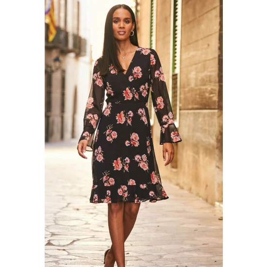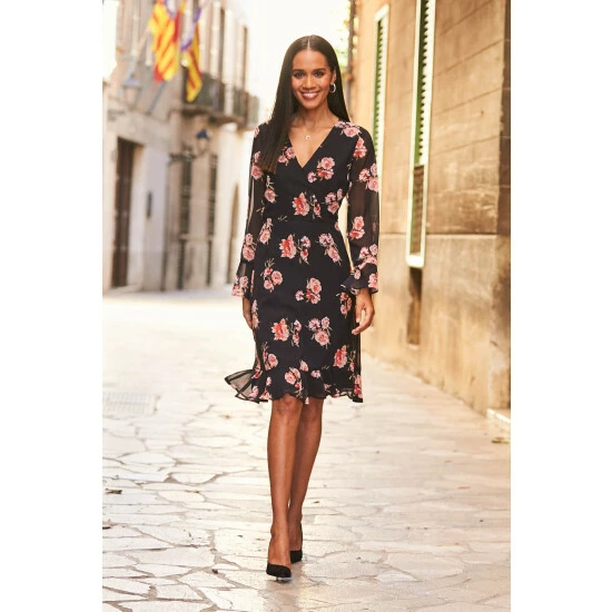 A brunch drinks or dinner kinda dress, made-to-flatter wrap design, pretty floral print you ll wear year-round, fluted sleeves because it s all in the details, keep it smart/casual with ankle boots, sex it up with strappy heels. Model is 5 9 and wears a UK size 8.