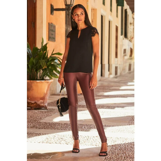 Nice top? we ve got you, gorgeous lace cap sleeves, luxe keyhole neckline with gold tab detail, comfy loose fit, you can t go wrong with jeans, it looks great with leather-look leggings too. Model is 5 9 and wears a UK size 8.