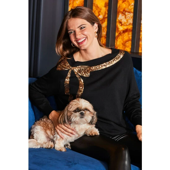 Festive chic all wrapped up, decorated with a shimmering gold sequin bow, lightweight but cosy knit, you ll wear it day and night, dress it up with a leather skirt and strappy heels, add jeans for a smart/casual festive look. Model is 5 9 and wears a UK size 8.