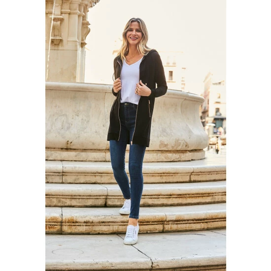 Loungewear upgrade incoming, made from the softest jersey for maximum comfort, flattering longline style, luxe rose gold zips and hardware, drawstring hood for extra warmth.