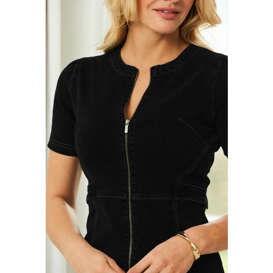 Sosandar Black Short Sleeve Round Neck Zip Front Denim Dress