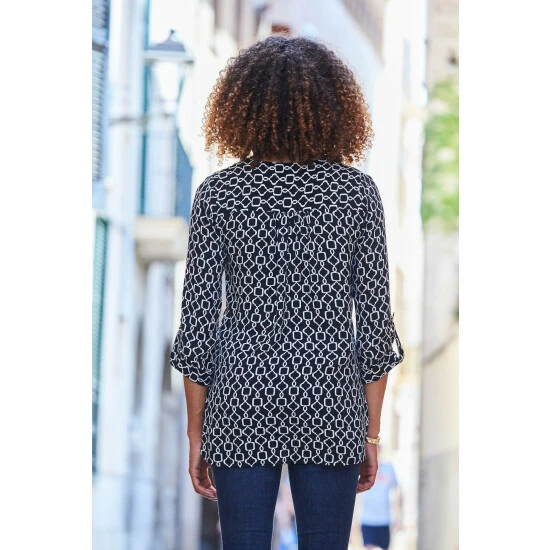 Style and comfort you can have it all, loose tunic shape, luxe gold zip details, on-trend geometric print, turn back tab detail sleeves, skinnies or leggings are all it needs. Model is 5.9″ and wears a UK size 8.