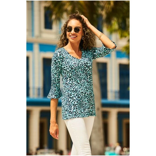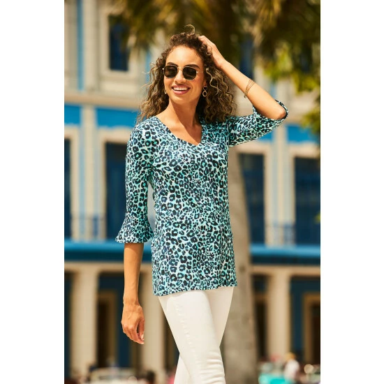 Sosandar Blue Animal Print Fluted Sleeve Top