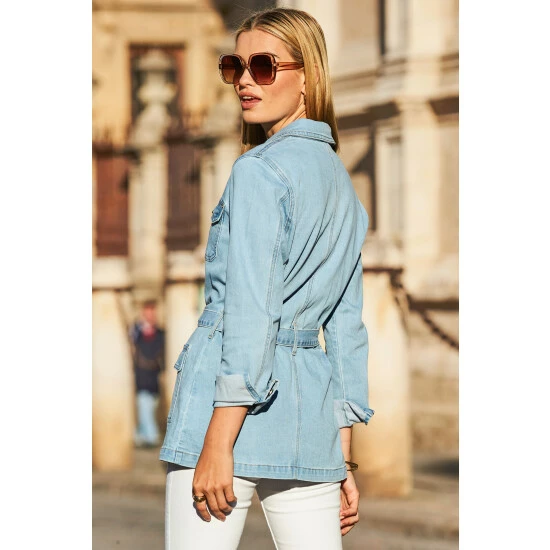 Introducing summer s coolest cover-up: on-trend shacket style – half-shirt-half-jacket, silver button fastening, patch pocket detail, and flattering waist tie.