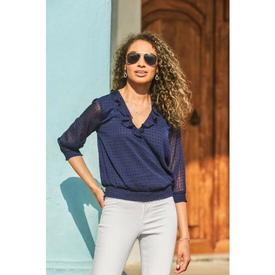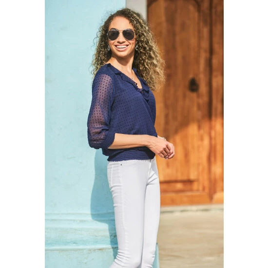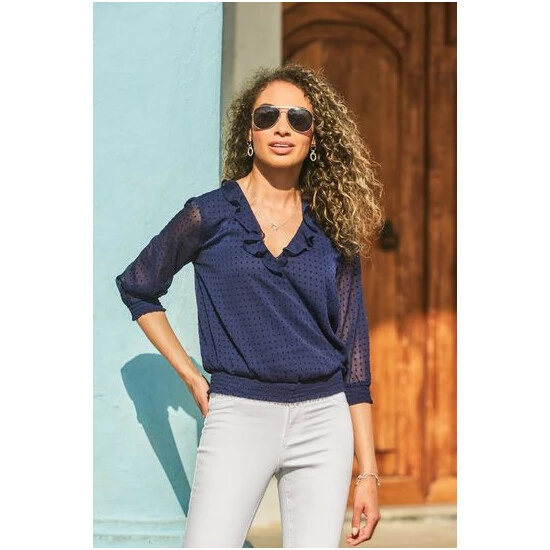 Your work-to-weekend wardrobe staple, textured dobby fabric, feminine ruffle detail, flattering wrap front, sexy sheer sleeves, comfy shirred hem. Model is 5 9 and wears a UK size 8.