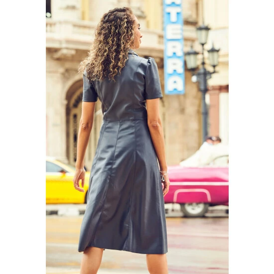 Compliments incoming: made from luxe faux leather, feminine puff sleeves, nipped-in waist + swishy midi skirt = seriously flattering, and silver popper fastening.