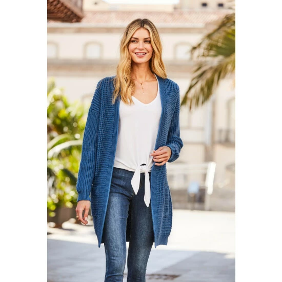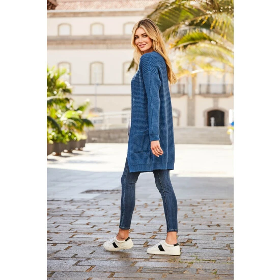 Up the cardigan ante: cosy and cool waffle knit texture, open front – cinch it with a belt to create shape, flattering dropped shoulders and longline hem, and pockets because everything is better with pockets.