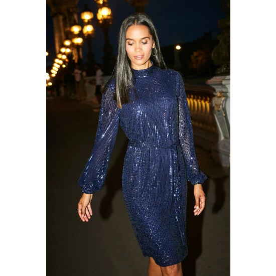Dazzle at date night or on the dance floor: shimmering all-over sequin embellishment, body-skimming shift for style and comfort, belt tie to nip in your waist, and chic high neck statement blouson sleeves.