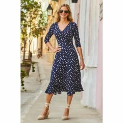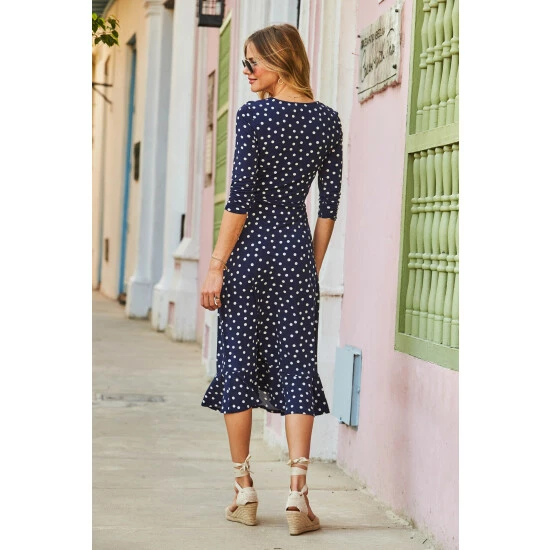 The dress that feels as good as it looks: super-comfy fabric, chic navy polka dot print, flattering V-neck and waist tie, and feminine ruffle hem.