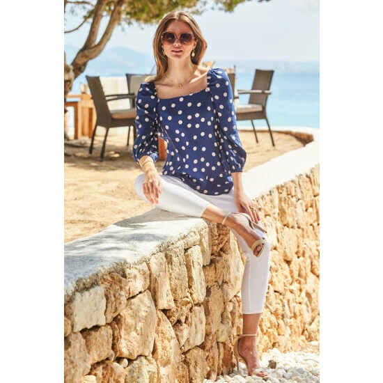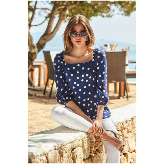 Taking nice tops to the next level, square necks are so on-trend, comfy body-skimming fit flattering longline hem, statement shirred cuff blouson sleeves, polka dots: always in style.
