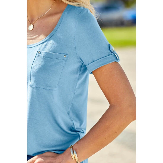 You ll wear it on repeat, luxe tab sleeve details, pocket studs, classic crew neck comfy loose fit, just add jeans and trainers, style with shorts and sandals on holiday. Model is 5 9 and wears a UK size 8.