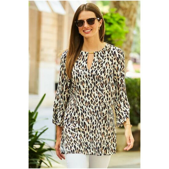 All of the impact none of the effort, chic but super comfy, luxe gold keyhole neck, standout fluted cuff sleeves, leopard print is always a good idea, skinnies or leggings are all it needs. Model is 5’7” and wears a UK size 8.