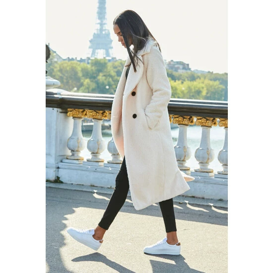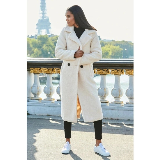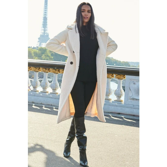 The winter coat of dreams, cosy borg fabric, chic cream shade goes with any outfit, midi length for extra warmth, contrasting black buttons, oversized lapels. Model is 5 9 and wears a UK size 8.