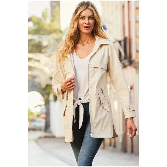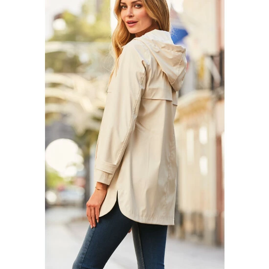 Stay dry on rainy days with this stylish rubber parka: raincoats have never looked so chic, shower-proof coating perfect for light rain, luxe gold press stud details, drawstring hood to keep you dry, and pockets because everything is better with pockets.