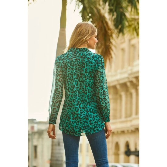 Sosandar Green Animal Print Sheer Sleeve Shirt