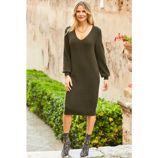 Sosandar Green Blouson Sleeve Relaxed Fit Jumper Dress