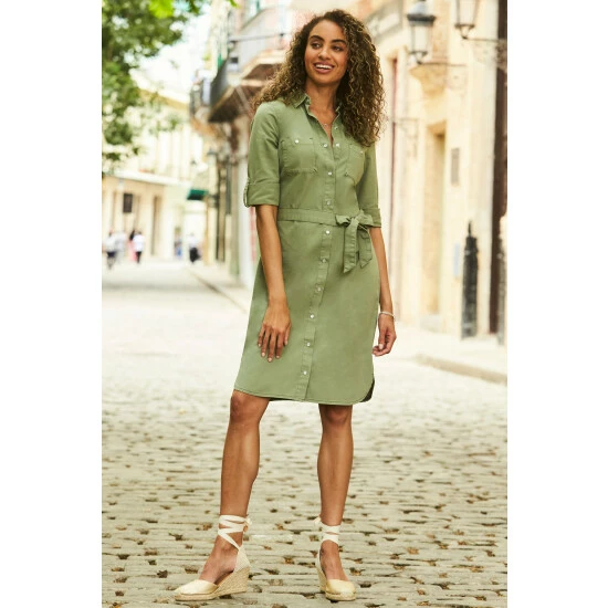 Who said casual can t be chic? Timeless shirt dress shape, waist-accentuating belt tie, popper fastening, patch pockets, turn back cuffs… it s the little details, and suits-everyone khaki shade.
