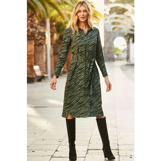 Sosandar Green Zebra Print Belted Midi Shirt Dress
