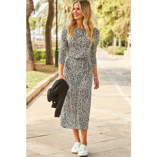 Sosandar Grey Animal Print Jersey Belted Midi Dress