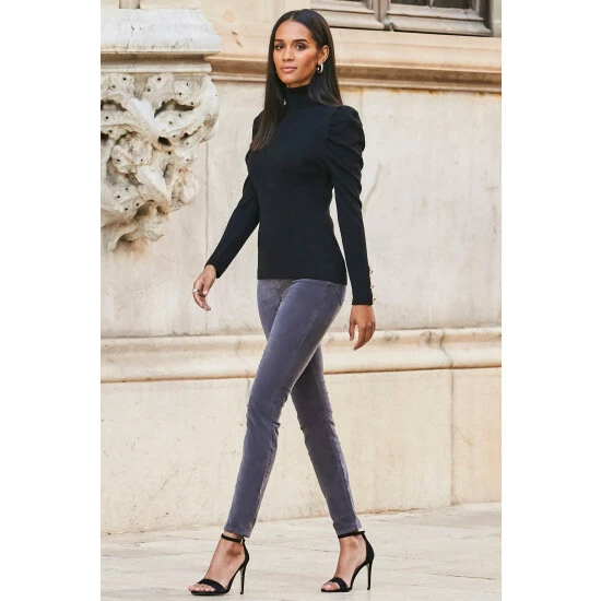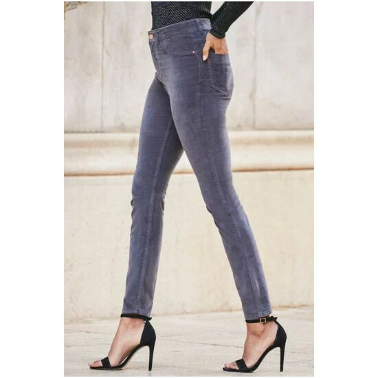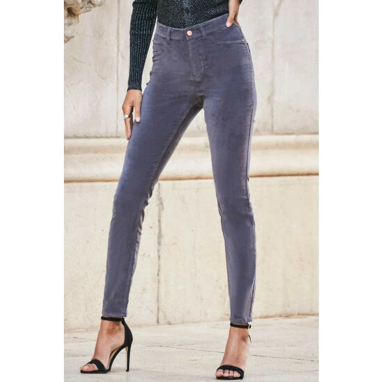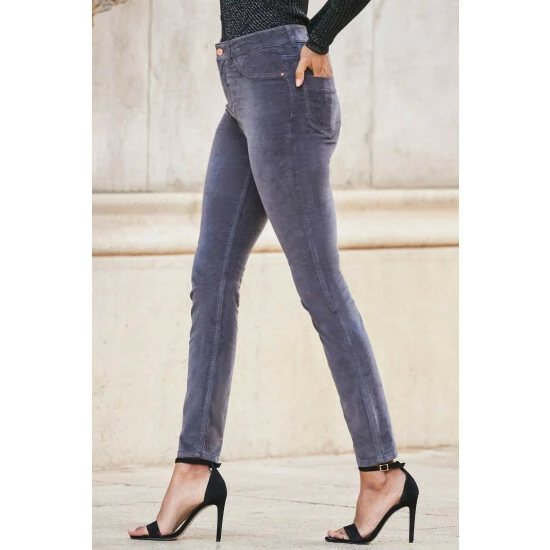 Your go-to jeans just got an upgrade, luxe velvet finish, classic skinny style, sexy feminine and chic, dress them up with a sparkly top, do casual chic with a cosy knit and ankle boots. Model is 5 9 and wears a UK size 8.