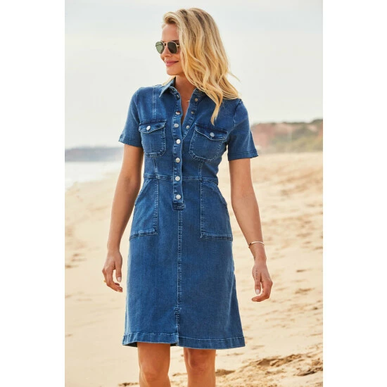 Sosandar Indigo Blue Popper Front Short Sleeve Stretch Denim Dress