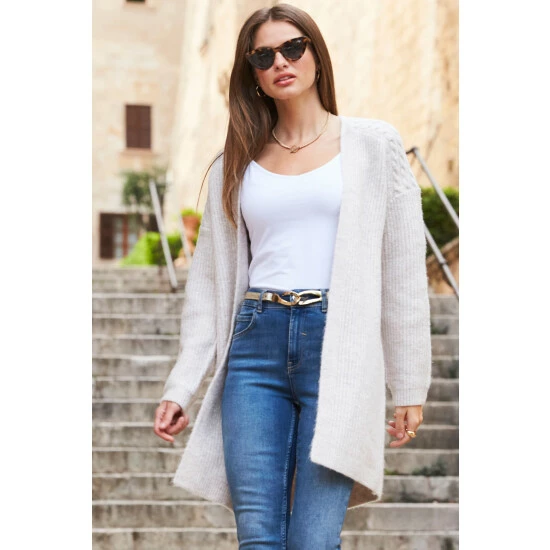 Cardigans have never looked so cosy, cable knit detail dropped shoulders, longline hem for extra cosiness, oatmeal colour goes with everything, wear it open or add a belt, just add jeans and boots. Model is 5 7 and wears a UK size 8.