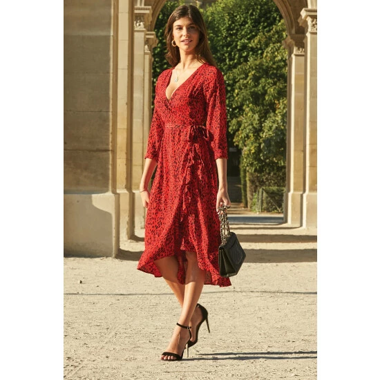 Sosandar Red Animal Print Ruffle Hem Midi Wrap Dress