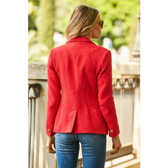 Your outfits deserve it, luxe boucle fabric, always-on-trend blazer style – wear it day and night, mood-boosting red shade, double-breasted button front, effortlessly chic with jeans and heels. Model is 5 9 and wears a UK size 8.