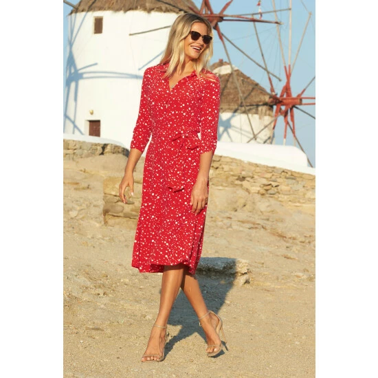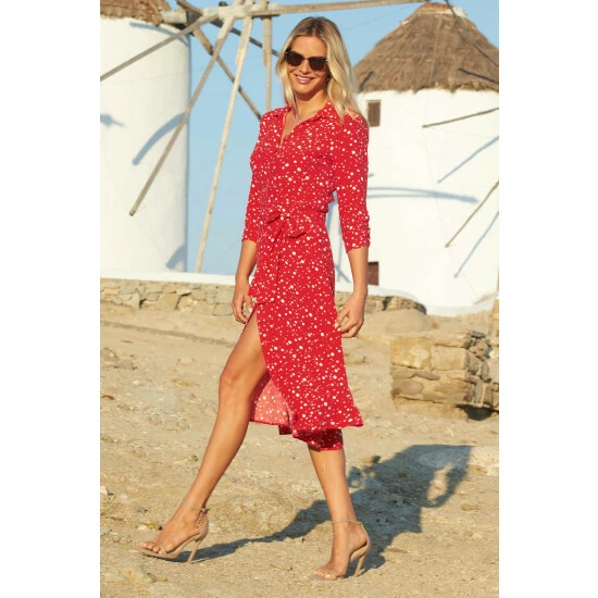 A wardrobe classic but make it statement, a confetti print you won t find elsewhere, work smart and weekend sexy, roll up the sleeves for a more relaxed look, flattering midi hem and belt tie.