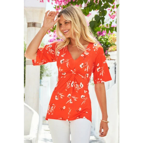 Sosandar Red Floral Print Angel Sleeve Twist Front Top