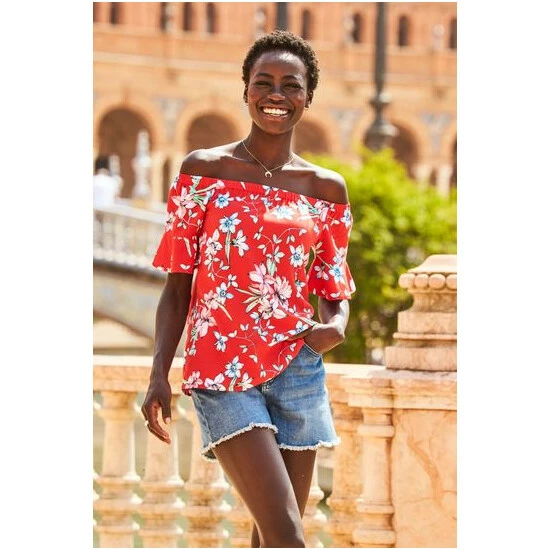 Sosandar Red Floral Print Fluted Sleeve Bardot Top