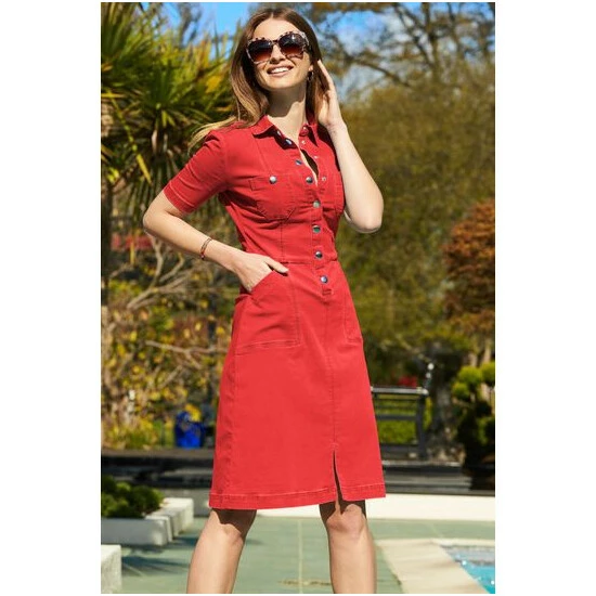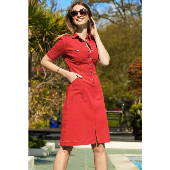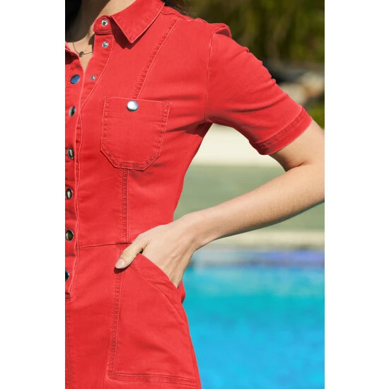 Sosandar Red Popper Front Short Sleeve Stretch Denim Dress