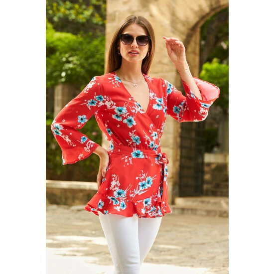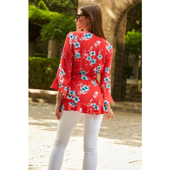 Wear-forever florals, mood-boosting red and blue blooms, feel-good wrap style, gorgeous ruffle hem and sleeves, tie belt to nip in your waist, add white jeans and red heels. Model is 5.7″ and wears a UK size 8.