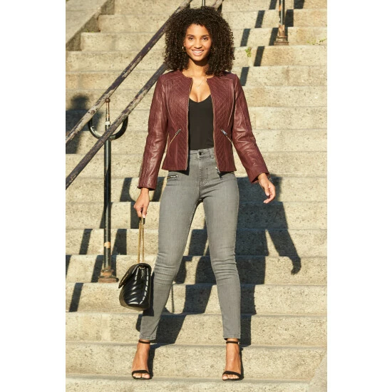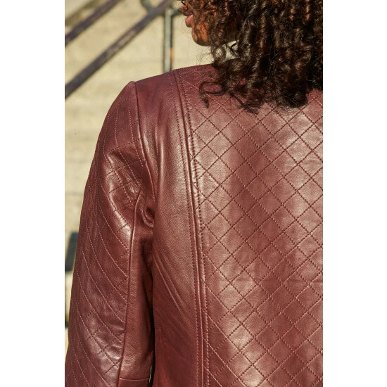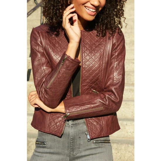 It s not like your other bikers: made from our signature buttery-soft leather, luxe quilted front panel and sleeves, cool collarless design, zip front, and side pockets.