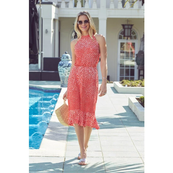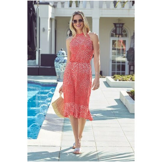 On-trend halter neck creates a statement silhouette, slinky fabric that hangs beautifully and feels amazing, elasticated waistband, and swishy ruffle hem – flattering and comfy.