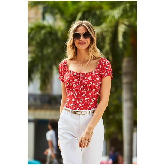 Sosandar Red Tie Front Square Neck Top