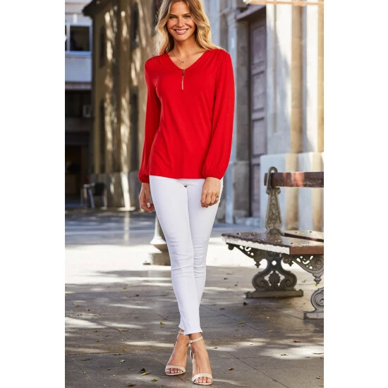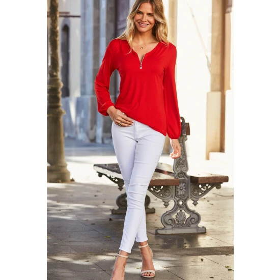 Upgrade your everyday look, loose fit drapes softly over the body, flattering v-neck with statement zip detail, on-trend blouson sleeves, longline hem – tuck it in or wear it loose, perfect with black or blue jeans. Model is 5 9 and wears a UK size 8.